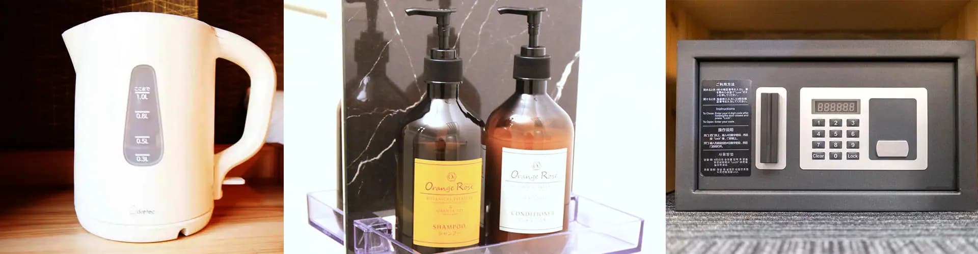エアコンディショナー / テレビ / 時計 / 温水洗浄トイレ / 金庫(ロビー) / 無料Wi-Fi / ドライヤー / 電気ケトル / 湯茶セット
