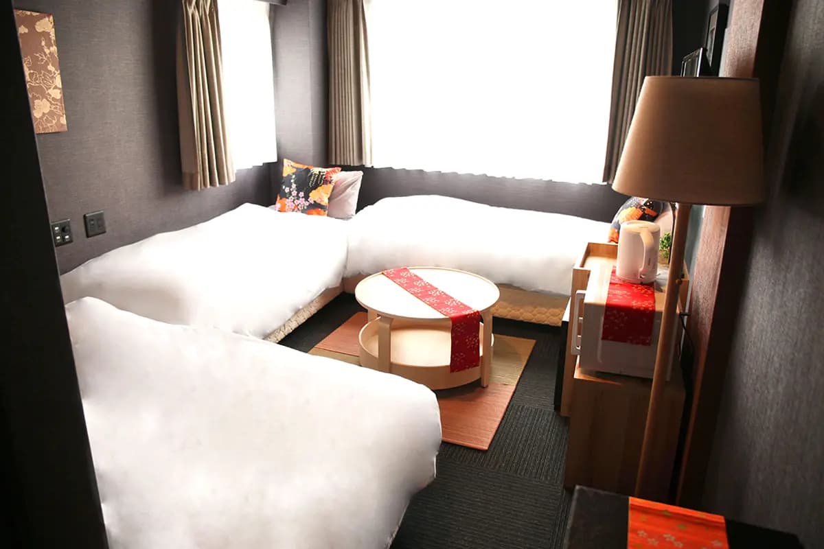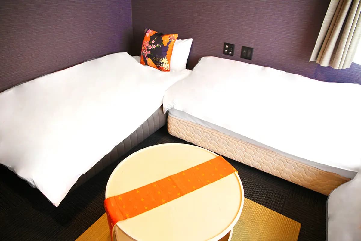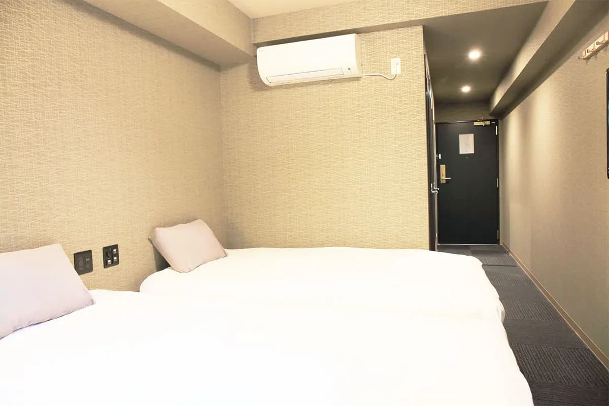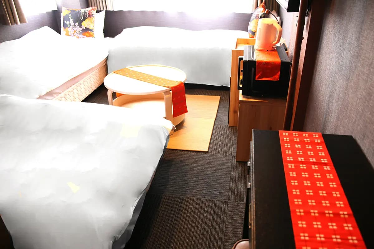シングルベッド2台・ソファーベッドを1台利用することにより、最大で3名様までご利用可能なお部屋となります。 中央にスペースを設けているので、長期滞在利用におすすめです。