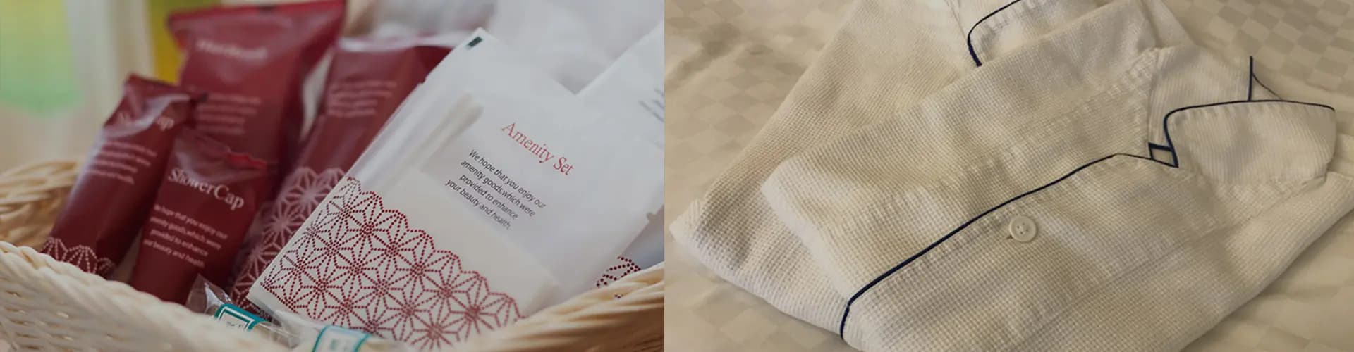 Bath towel / Face towel / Hand towel / Shampoo / Conditioner / Body soap / Hand soap / Cotton swab / Cotton / Toothbrush / Hairbrush / Razor / Slippers / Nightwear